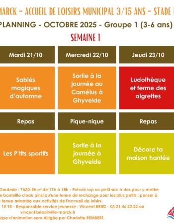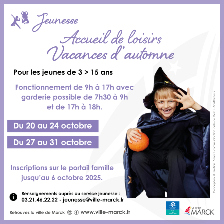 Cette année l'accueil de loisirs se déroulera du 20 au 24 octobre & du 27 au 31 octobre à la journée ! Un service de garderie est proposé à partir de 7h30 & jusqu'à 18h.