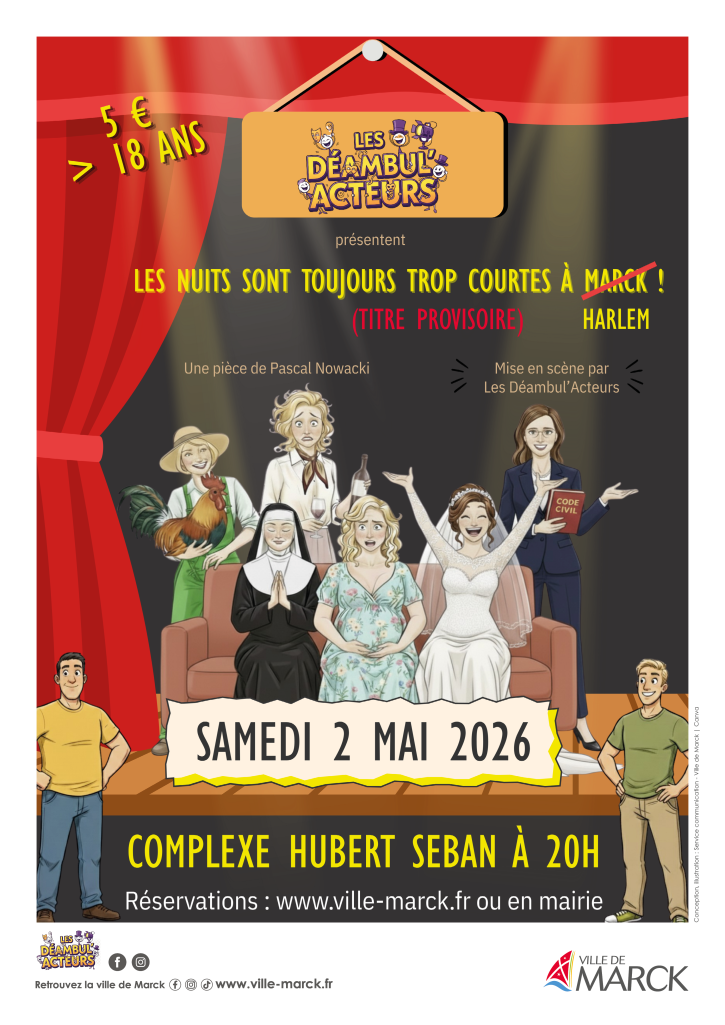 Une idée folle, un peu d’audace, de la bonne humeur… Et voilà qu’une petite troupe de théâtre amateur voit le jour il y a plusieurs mois à Marck : Les Déambul’Acteurs ! Pour la première fois, la troupe locale se produit au complexe Hubert Seban le samedi 2 mai à 20h avec leur pièce « Les nuits sont trop courtes à Harlem – Titre provisoire ». Une comédie de Pascal Nowacki mise en scène par les Déambul'acteurs